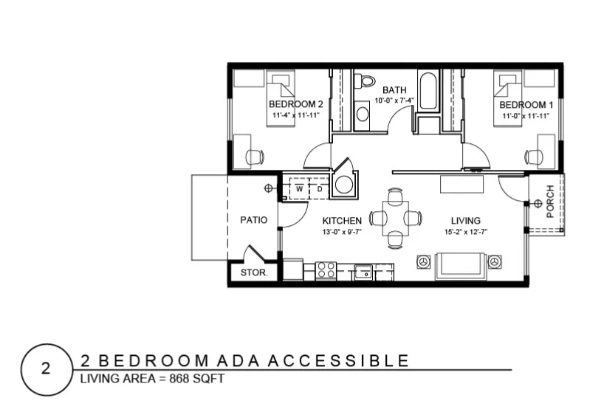 2 Bedroom Townhome ADA | $320 - $735 | 2 bed / 1 bath | 868 Sq. Ft. | Plan Layout |