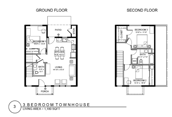 3 Bedroom Townhome | $840 - $1100 | 3 bed / 1.5 bath | 1180 Sq. Ft. | Plan Layout |