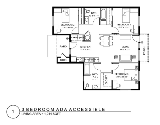 3 Bedroom Townhome ADA | $840 - $1100 | 3 bed / 2 bath | 1244 Sq. Ft. | Plan Layout |