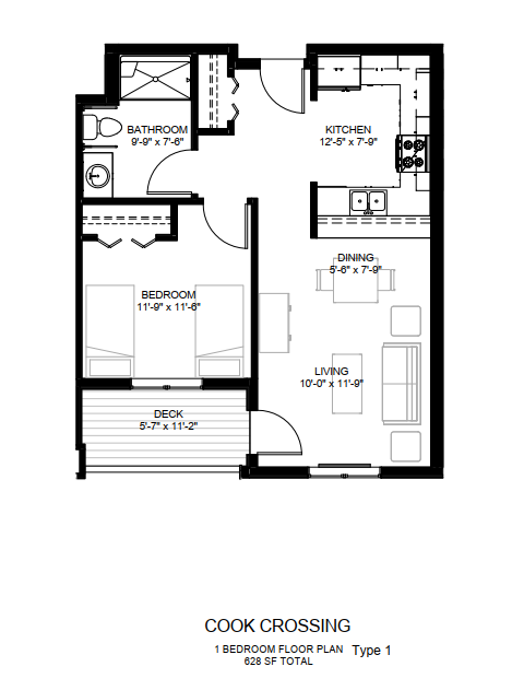 1 Bedroom Type 1A | $471 - $641 | 1 bed / 1 bath | 628 Sq. Ft. | Plan Layout |