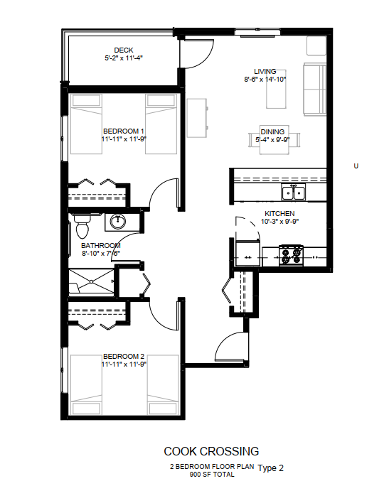 2 Bedroom Type 2 | $767 - $767 | 2 bed / 1 bath | 900 Sq. Ft. | Plan Layout |