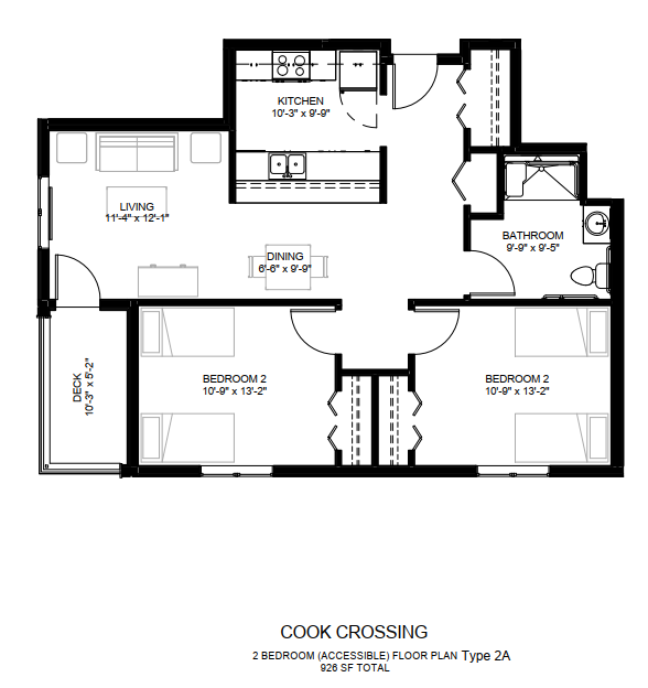 2 Bedroom ADA Type 2A | $767 - $767 | 2 bed / 1 bath | 926 Sq. Ft. | Plan Layout |