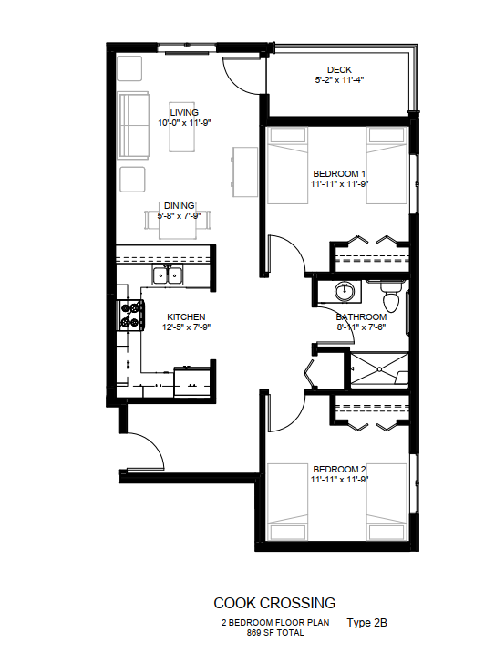 2 Bedroom Type 2B | $767 - $767 | 2 bed / 1 bath | 869 Sq. Ft. | Plan Layout |