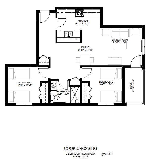 2 Bedroom Type 2C | $767 - $767 | 2 bed / 1 bath | 888 Sq. Ft. | Plan Layout |