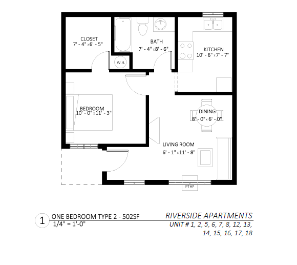1 Bedroom Type 1 | $525 - $625 | 1 bed / 1 bath | 541 Sq. Ft. | Plan Layout |