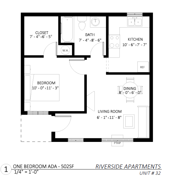 1 Bedroom ADA | $525 - $625 | 1 bed / 1 bath | 541 Sq. Ft. | Plan Layout |
