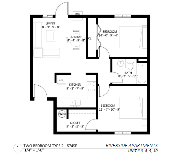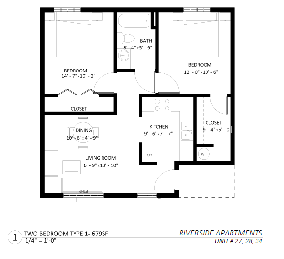 2 Bedroom Type 1 | $626 - $725 | 2 bed / 1 bath | 741 Sq. Ft. | Plan Layout |