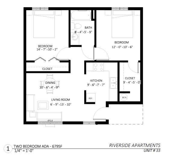 2 Bedroom ADA | $626 - $725 | 2 bed / 1 bath | 741 Sq. Ft. | Plan Layout |