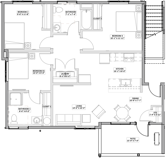 3 Bedroom | $1050 - $1050 | 3 bed / 2 bath | 1,138-1,178 Sq. Ft. | Plan Layout |