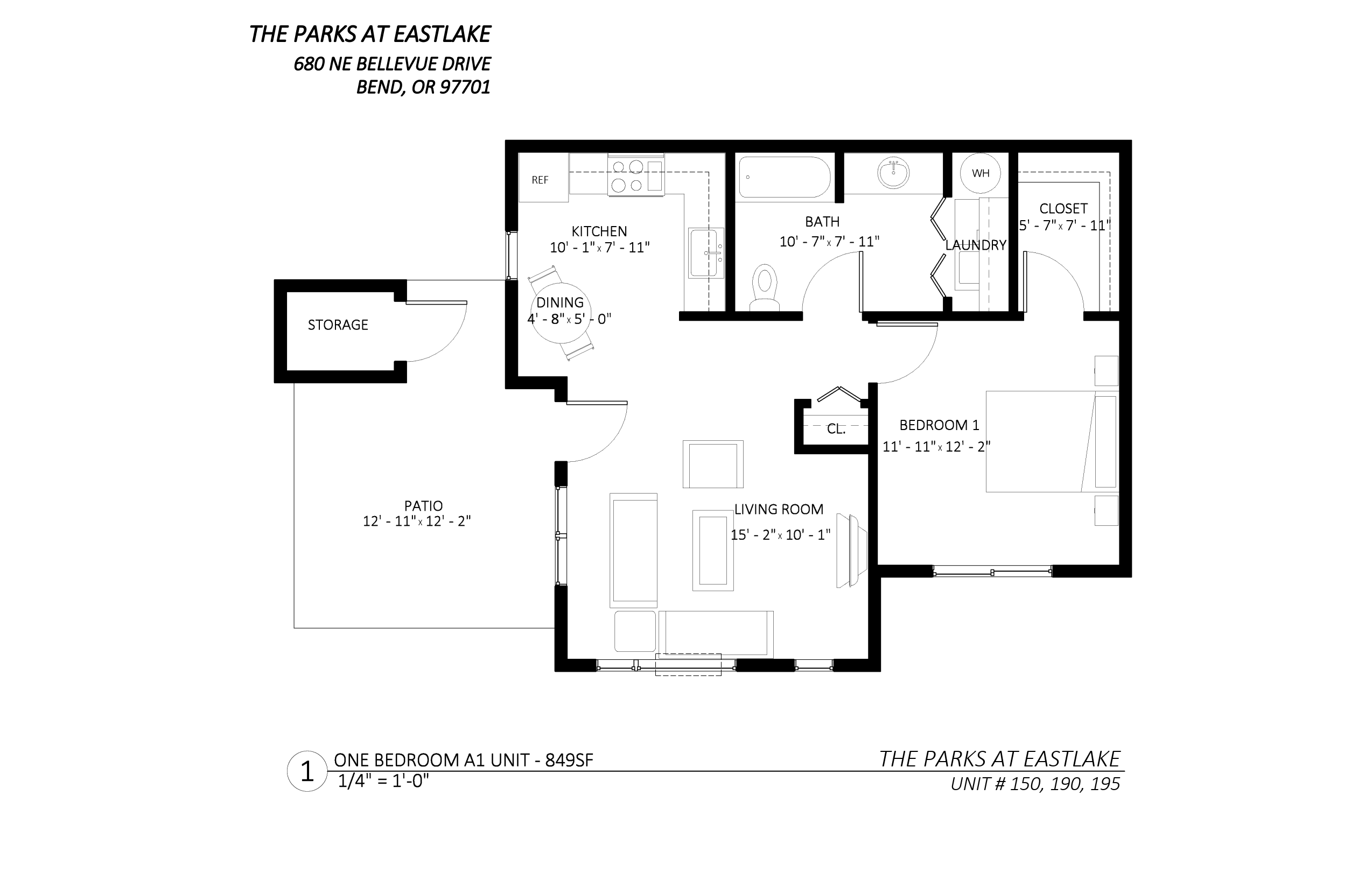 1 Bedroom | $600 - $800 | 1 bed / 1 bath | 639 Sq. Ft. | Plan Layout |
