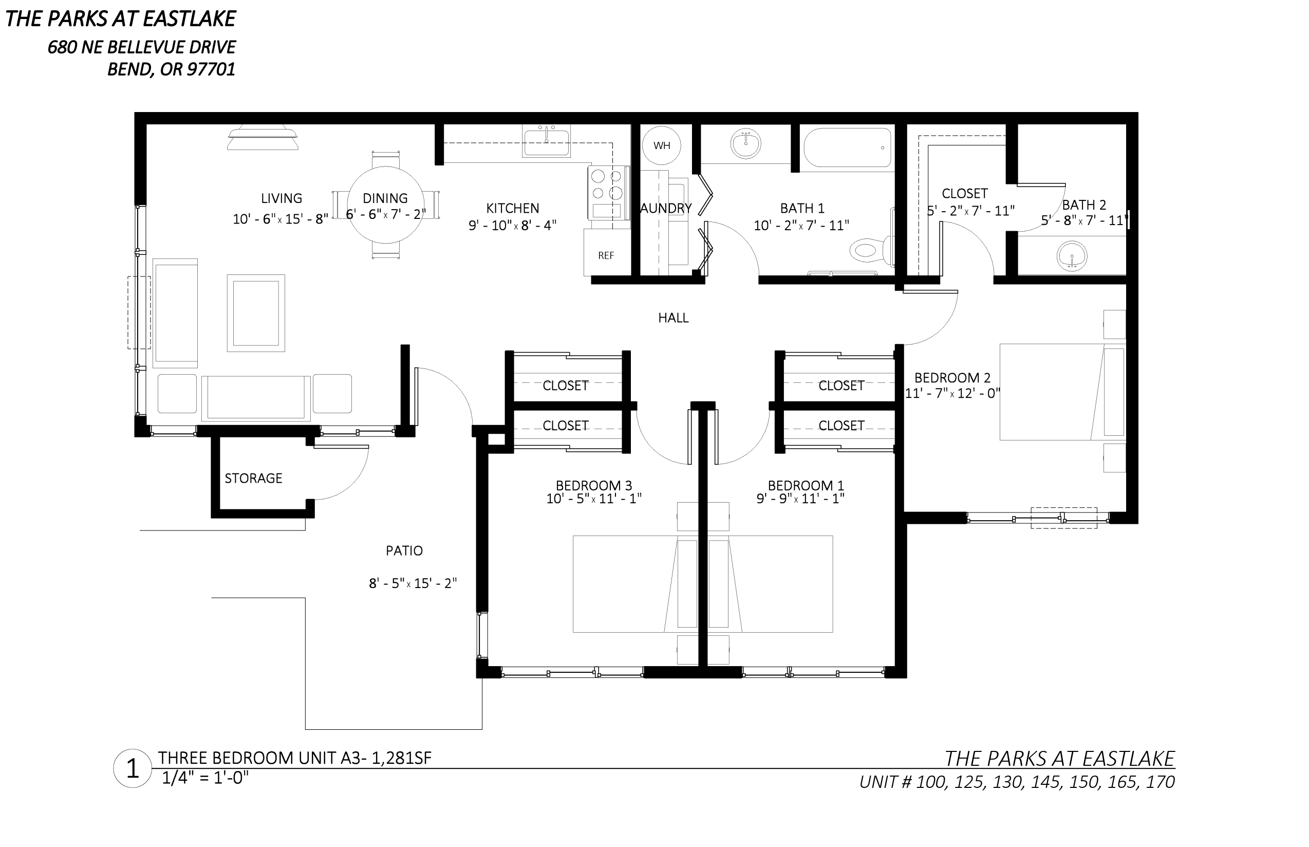 3 Bedroom | $800 - $1050 | 3 bed / 2 bath | 1,111 Sq. Ft. | Plan Layout |