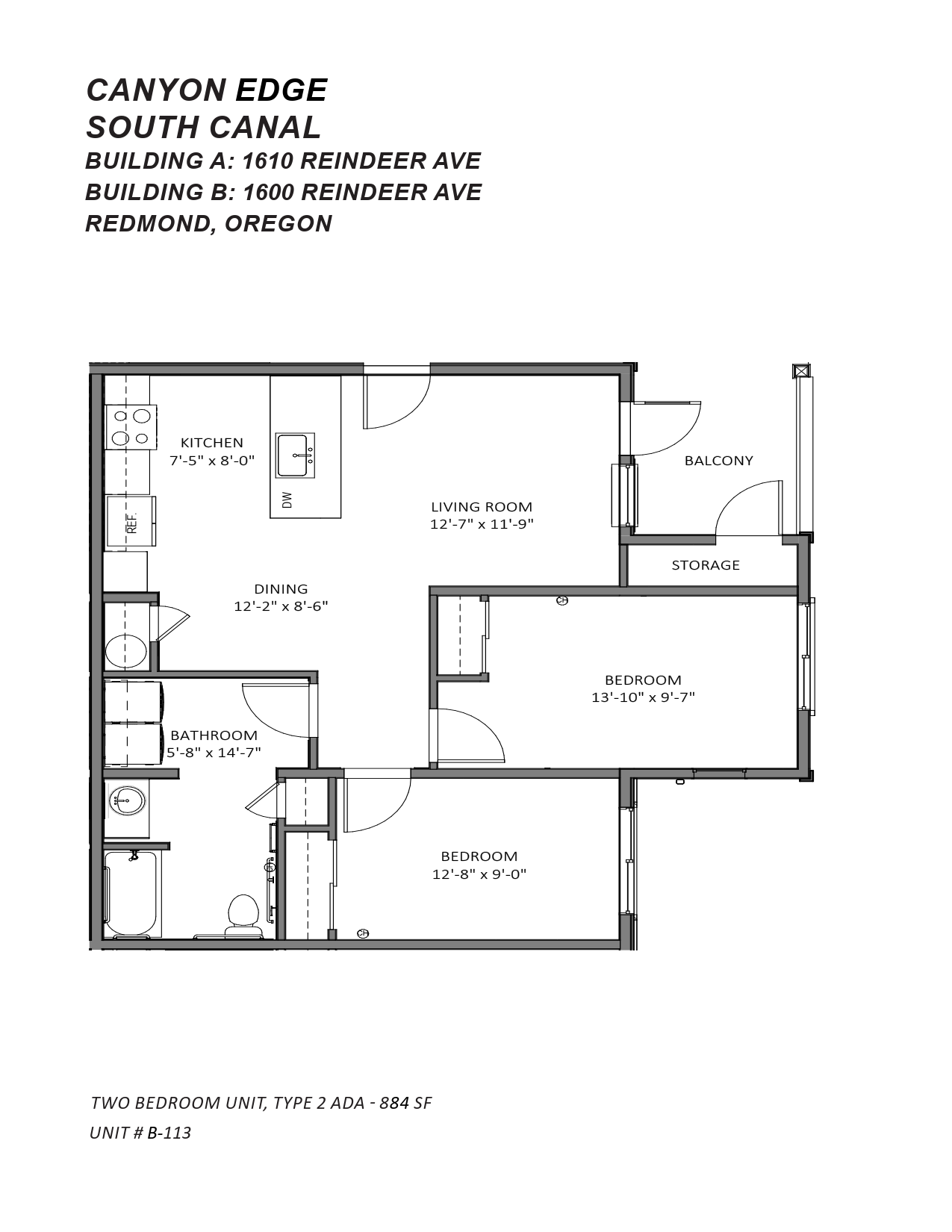 | 2 Bedroom ADA | $536 - $1176 | 1 bed / 1 bath | 884 Sq. Ft. | Plan Layout |