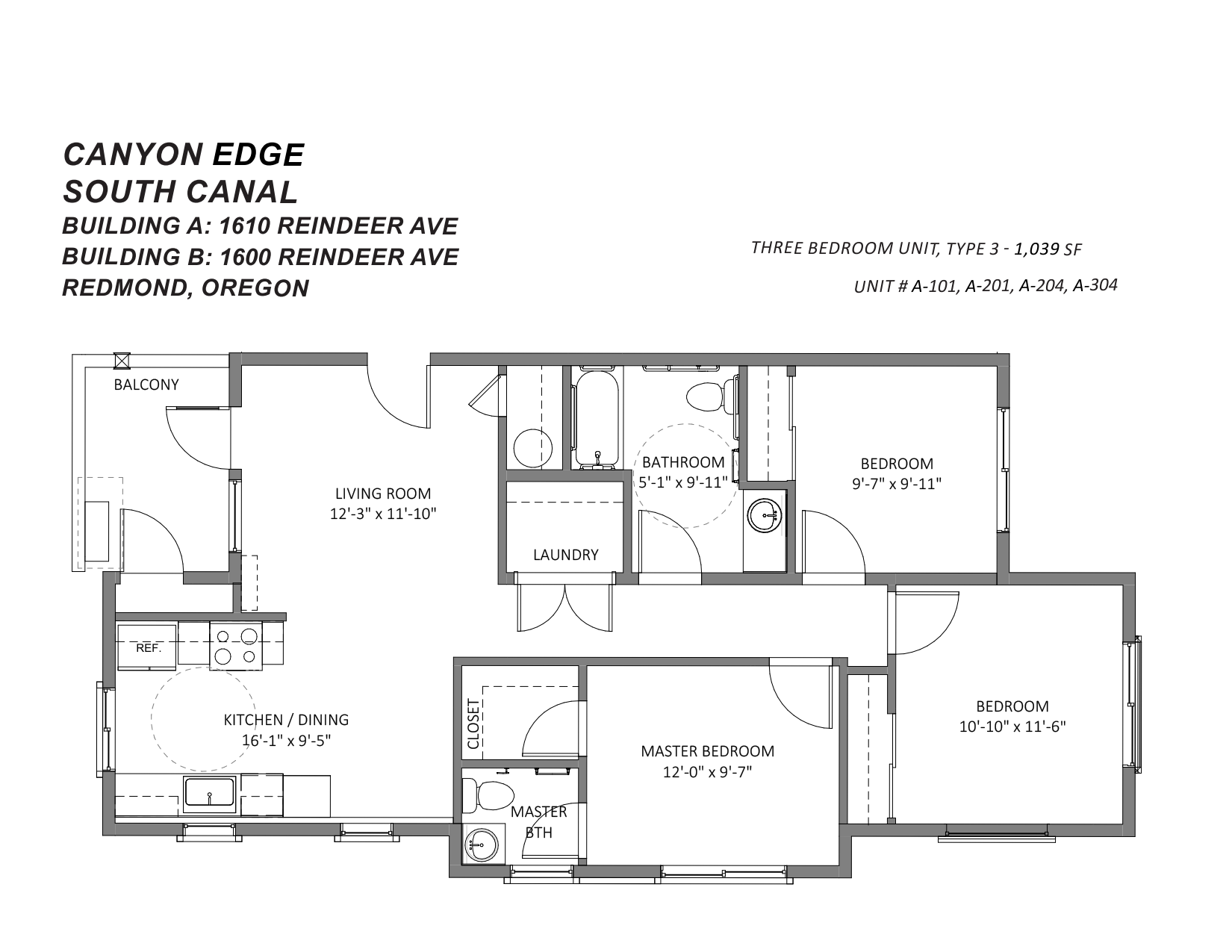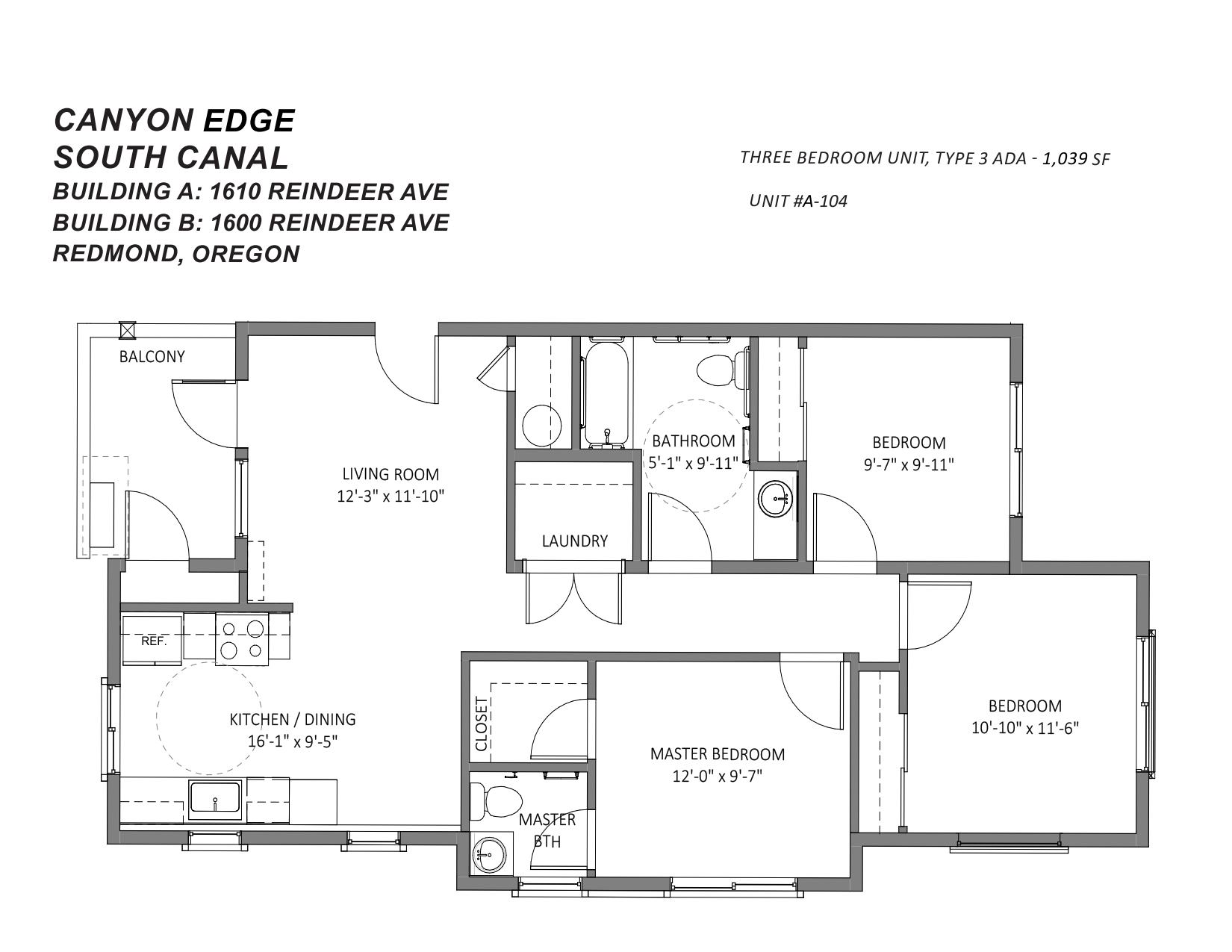 | 3 Bedroom ADA | $1296 - $1355 | 3 bed / 1.5 bath | 1,039 Sq. Ft. | Plan Layout |